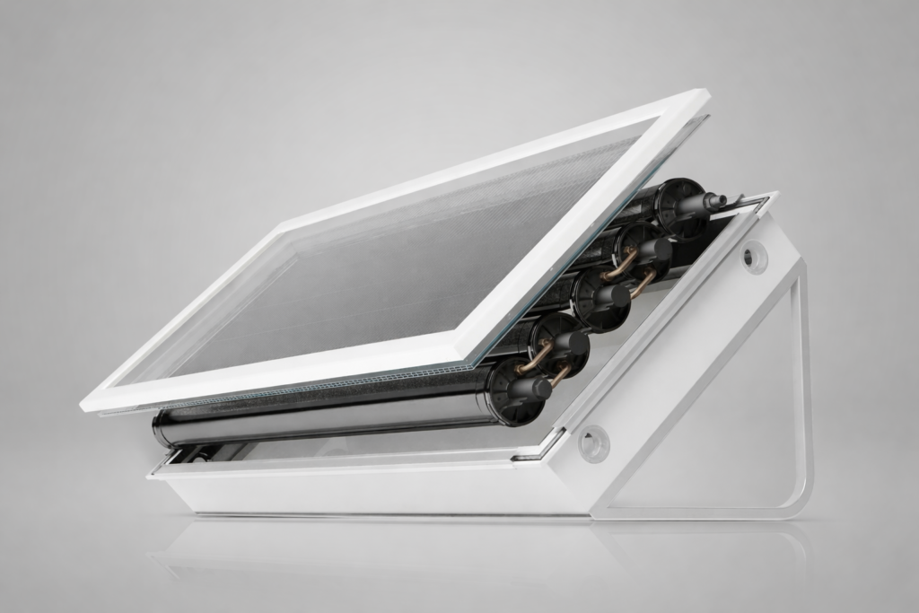 Similarly, the EGO smart panel requires no circulator—the sun directly heats domestic water flowing through the panel using mains pressure.